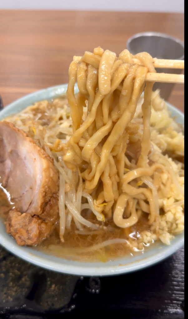 麺は極太のオーション麺。300gと聞くと一見多そうだが、茹で上がり後は食感が強く空気を含むため、見た目ほど重くはない。ただし、二郎系に慣れていない人には想像以上のボリュームなので、初訪時は注意したい。