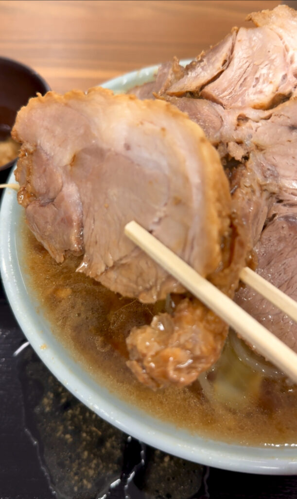 チャーシューは親指ほどの厚みがあり、箸で持ち上げただけで重量感が伝わる。