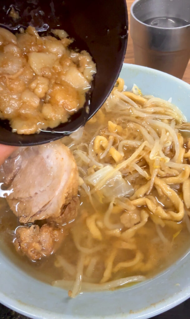 これが二郎系のラーメンに乗ることで、豪快な麺と野菜の山、背脂の濃厚さに並ぶ「第三の主役」として成立している。