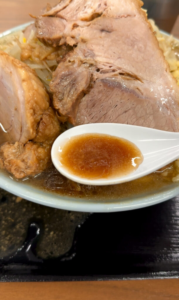 一般的な“二郎系=ドロリとした乳化スープ”というイメージとは一線を画す。脂と出汁が分離気味で、骨由来のミネラル感と醤油の香りがくっきり立ち上がる。
