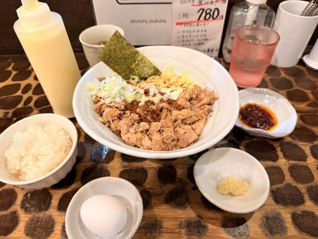 ラー油とにんにくのピリッとした刺激、マヨネーズと温玉のまろやかさ、焦がしチーズの香ばしさが、それぞれの役割を果たしながらごはんの甘みと融合します。特に温玉の黄身がタレと混ざり合った瞬間、全体はまるで“濃厚リゾット”のような味わいへと変化。麺とはまったく違う角度から、油虎の世界を堪能できます。