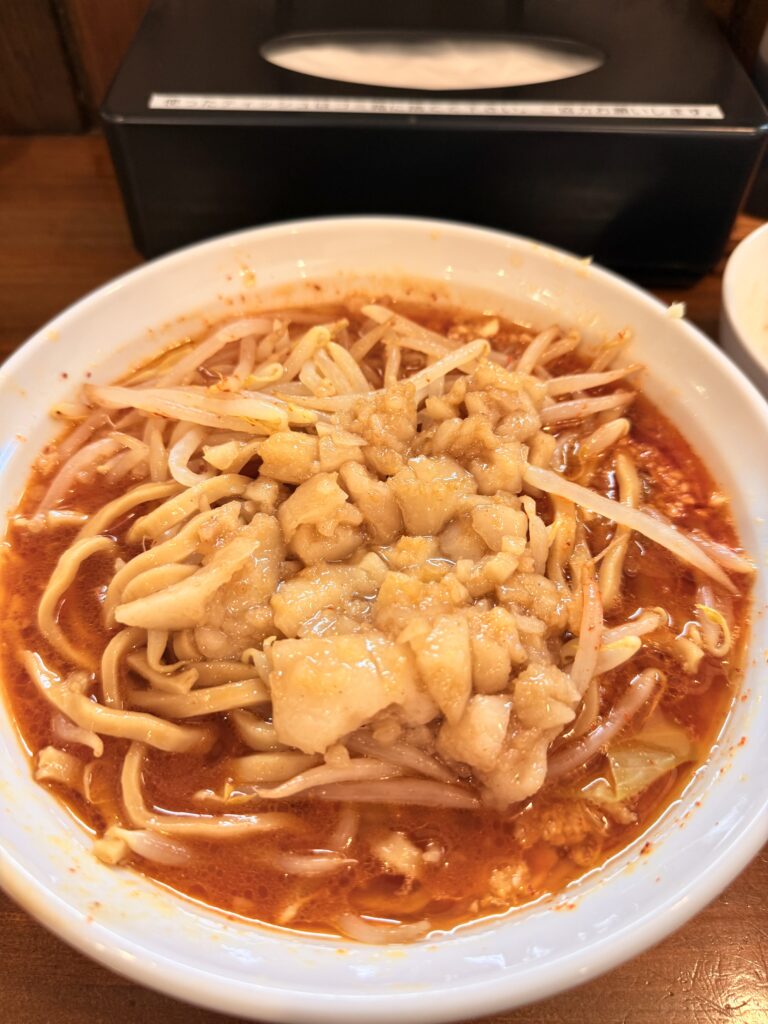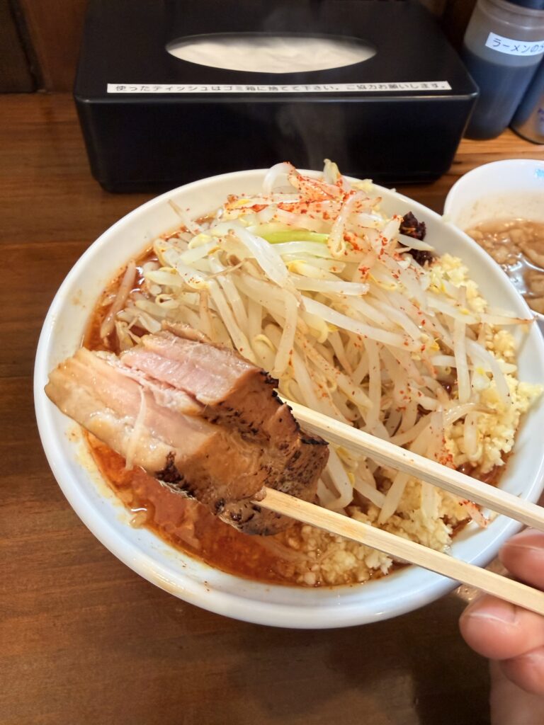 山頂に盛られた豆板醤と一味、太麺、背脂、豚――そのすべてが“辛さ”を主役にまとめ上げられ、食べ進めるほどに表情を変えていく。