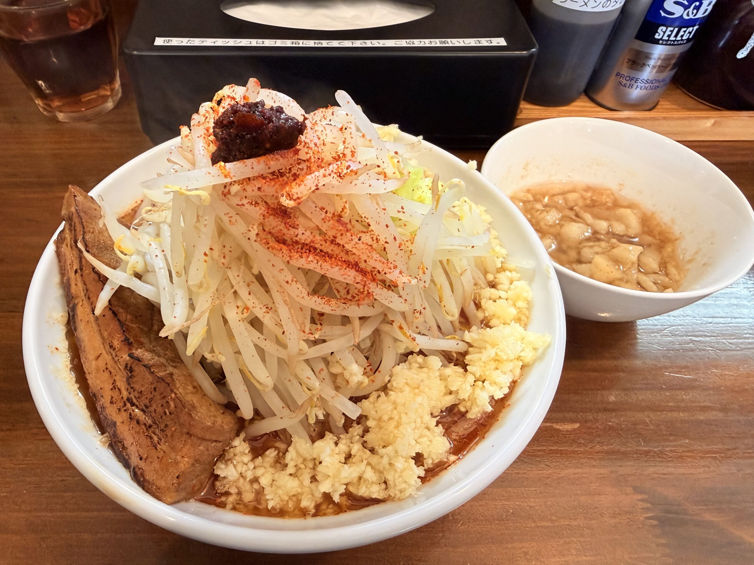 山頂に盛られた豆板醤と一味、太麺、背脂、豚――そのすべてが“辛さ”を主役にまとめ上げられ、食べ進めるほどに表情を変えていく。