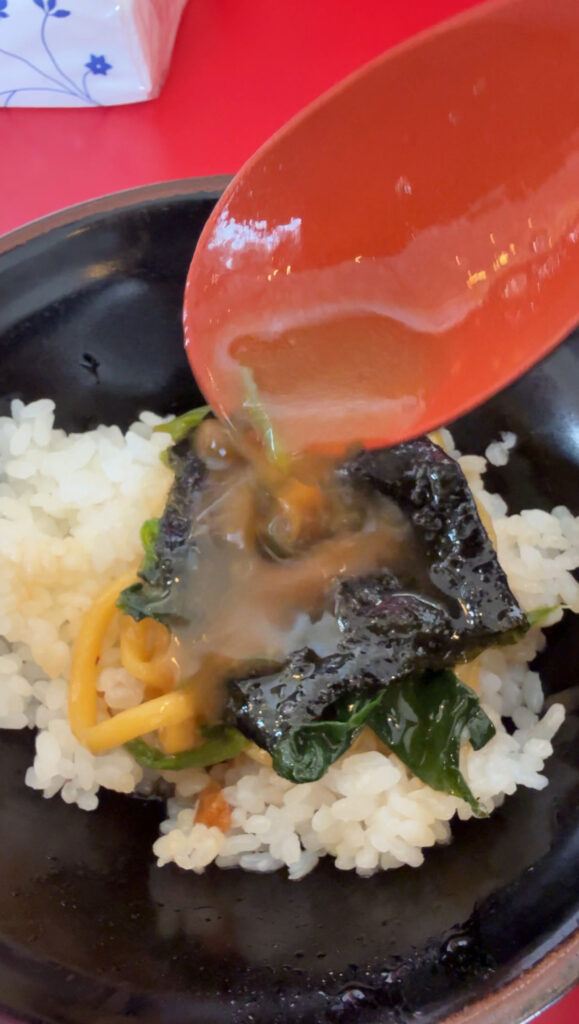 濃厚な家系スープと海苔、そしてライスの組み合わせは定番中の定番で、もはやセットで食べるのが「正解」といえるほど。スープを吸った海苔でライスを巻いた瞬間、豚骨の旨味と醤油の香ばしさが口いっぱいに広がり、箸が止まらなくなります。濃いめのスープを最後まで楽しむには、ライスは欠かせない存在です。