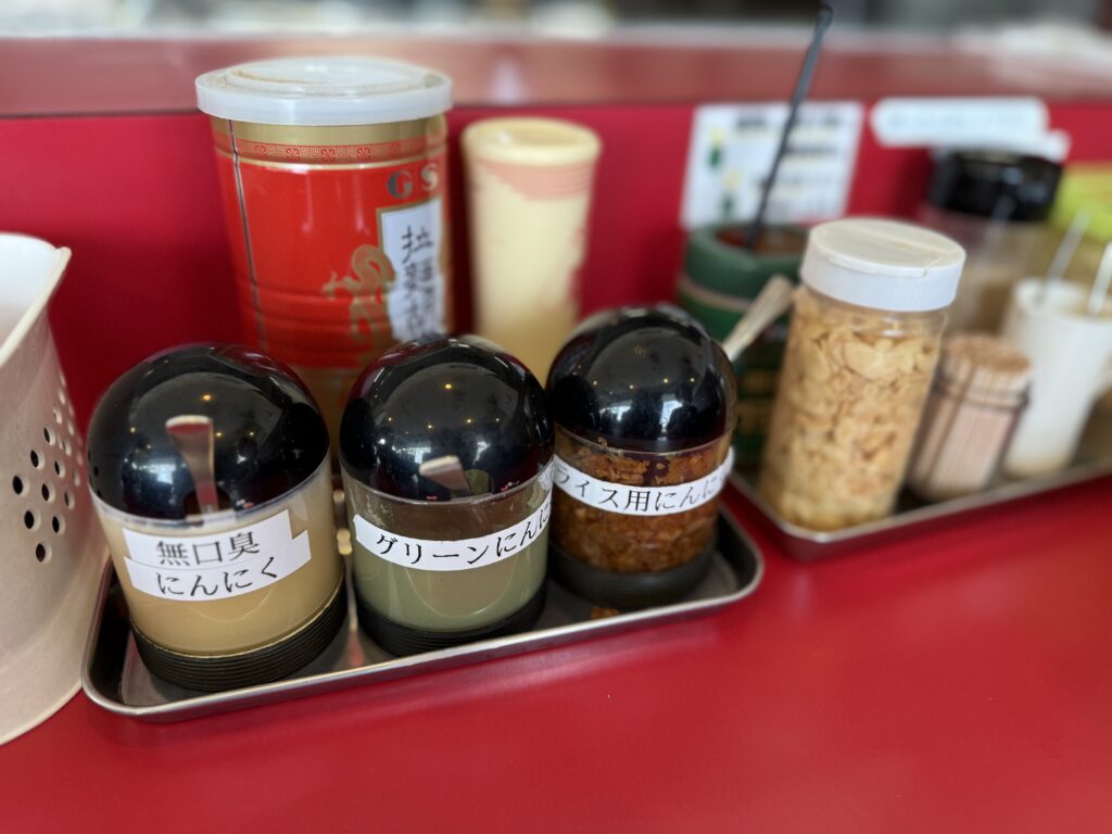 卓上には、多種多様なニンニク・生姜・胡椒などの味変アイテムが充実しており、自分好みにアレンジできるのも醍醐味です。